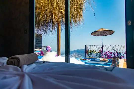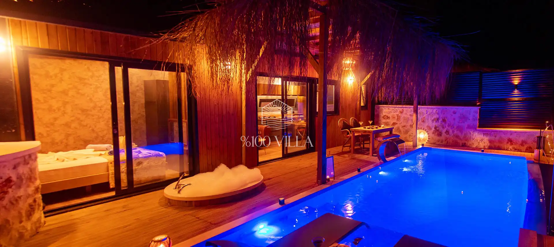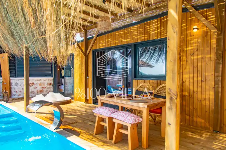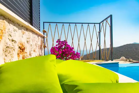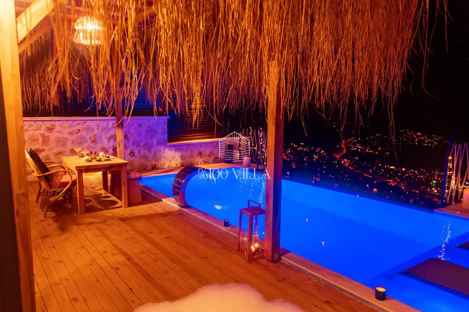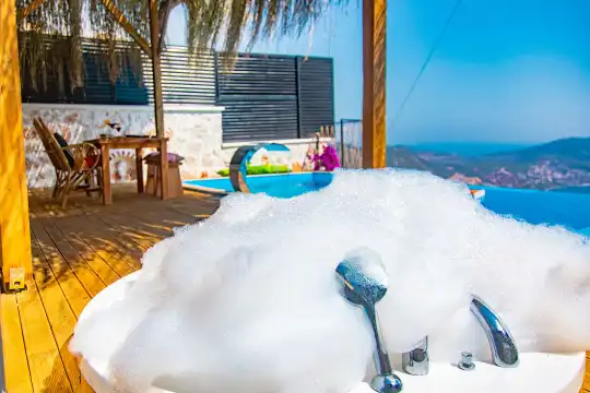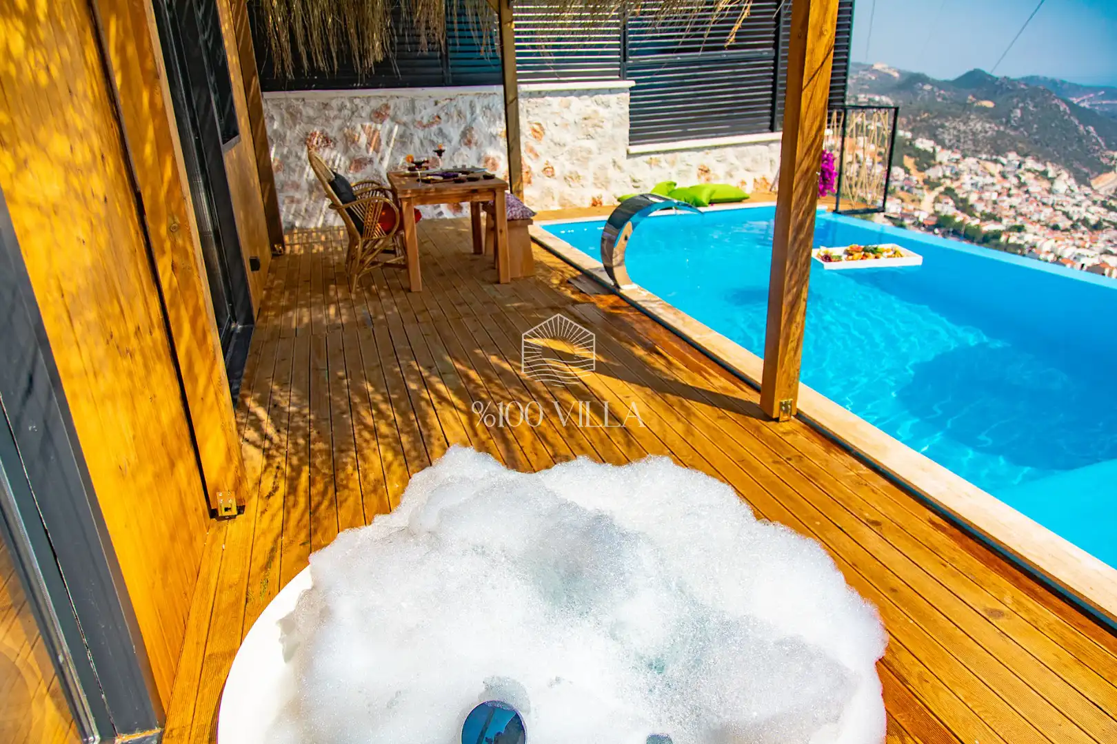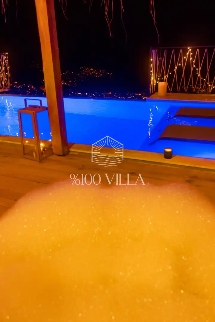 Muhteşem bir deniz manzarasına sahip olan villamız havuz terasının korunaklı yapısından dolayı ve balayı çiftleri için oldukça idealdir. Sevdiklerinizle birlikte günbatımına karşı içeceklerinizi yudumlayıp manzaranın tadını çıkarabilirsiniz. Villamızda bulunan jakuzi ise rahatlayıp tüm yılın yorgunluğunu üzerinizden atmanıza yardımcı olacaktır.