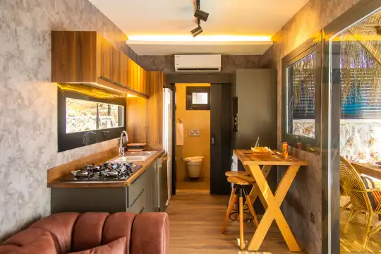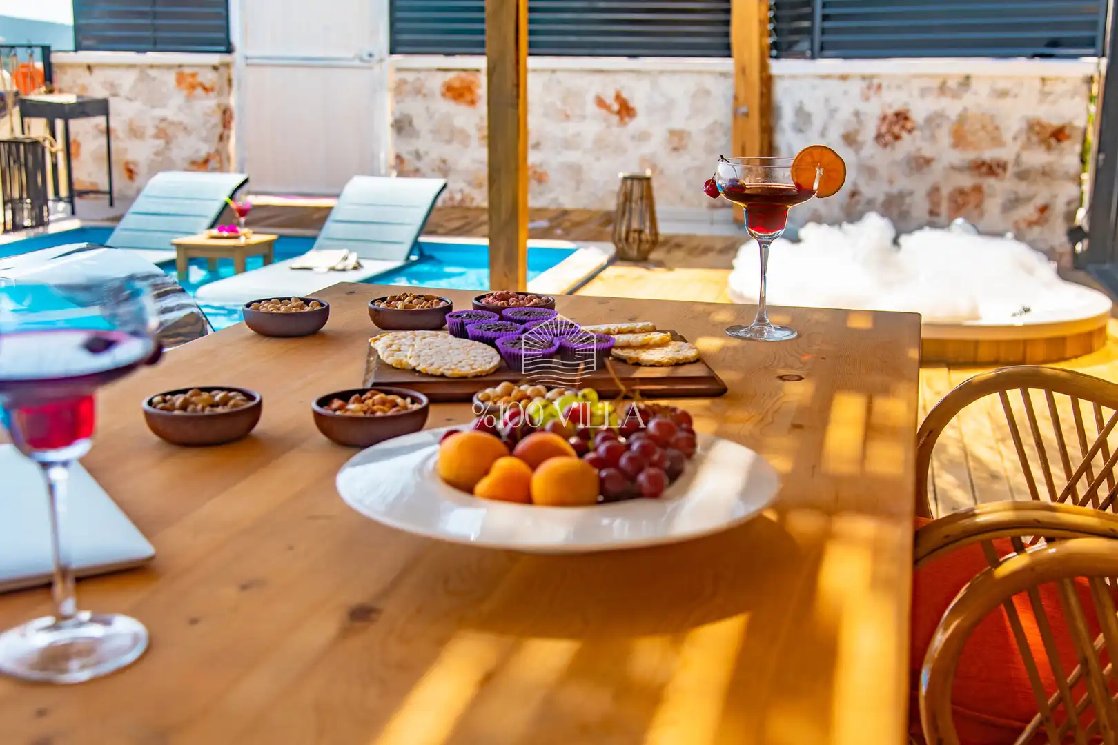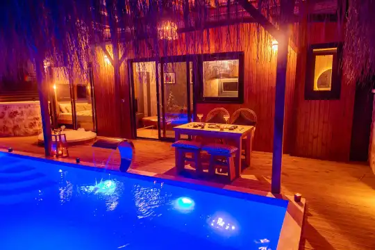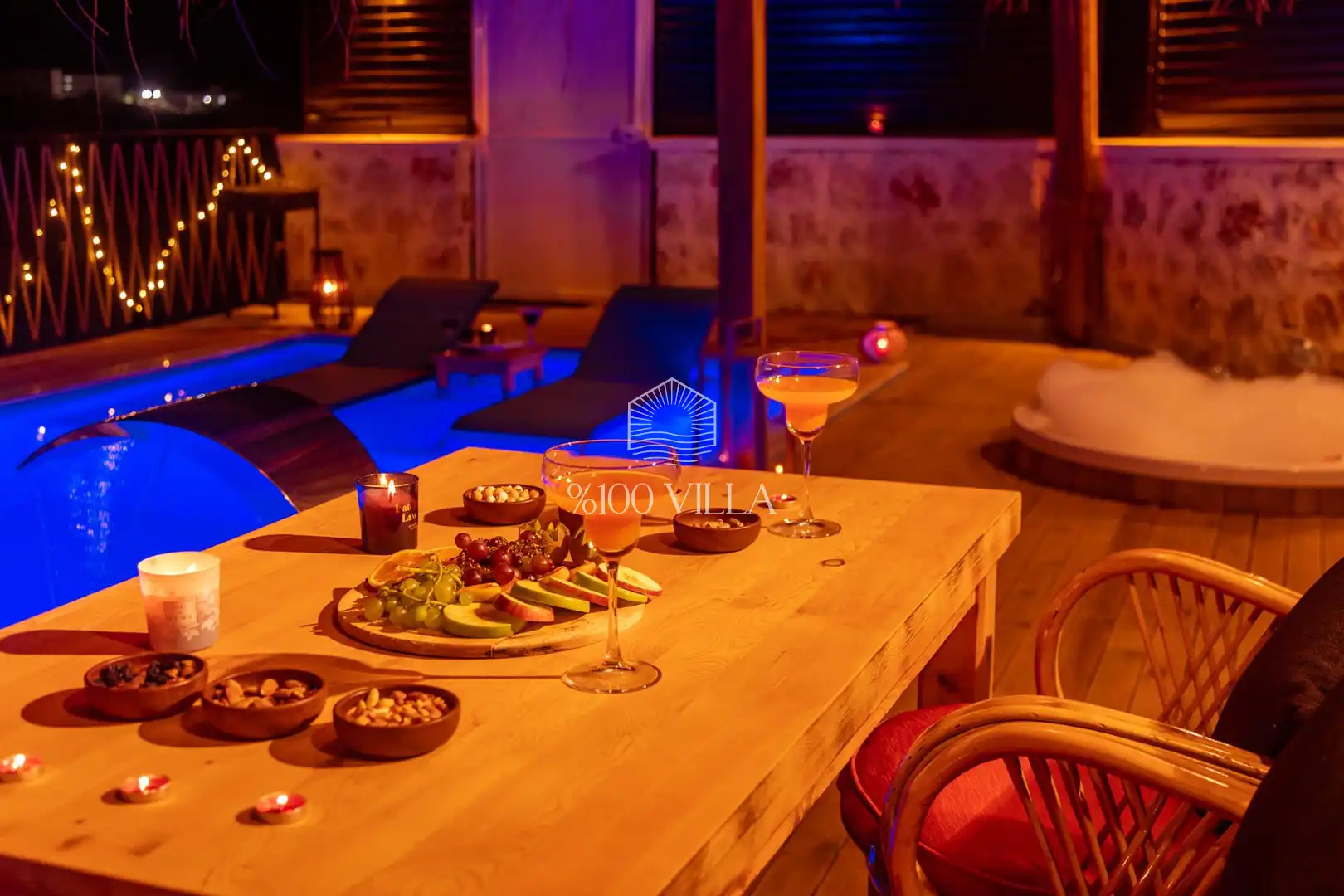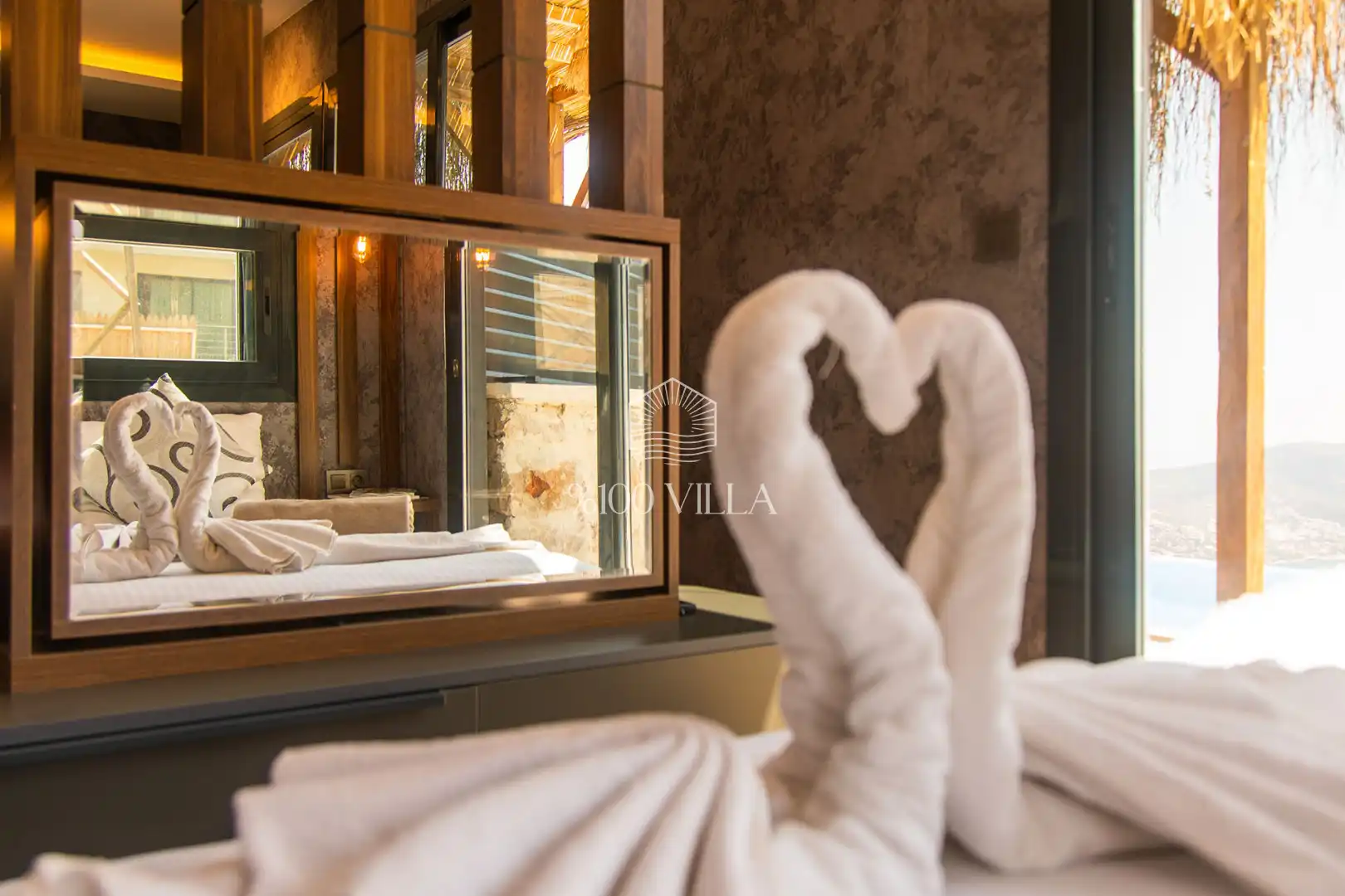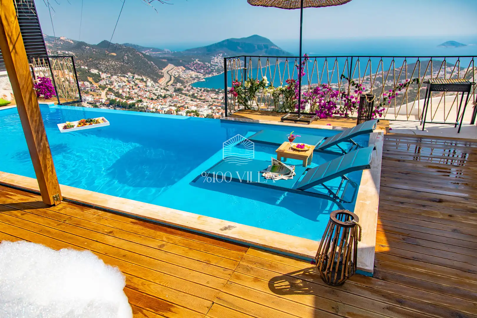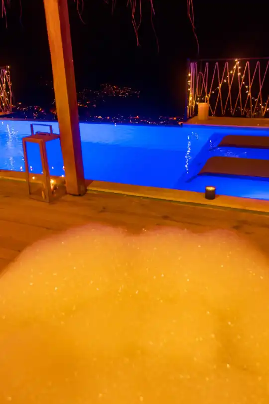 Muhteşem bir deniz manzarasına sahip olan villamız havuz terasının korunaklı yapısından dolayı ve balayı çiftleri için oldukça idealdir. Sevdiklerinizle birlikte günbatımına karşı içeceklerinizi yudumlayıp manzaranın tadını çıkarabilirsiniz. Villamızda bulunan jakuzi ise rahatlayıp tüm yılın yorgunluğunu üzerinizden atmanıza yardımcı olacaktır.