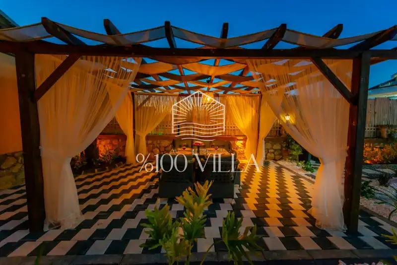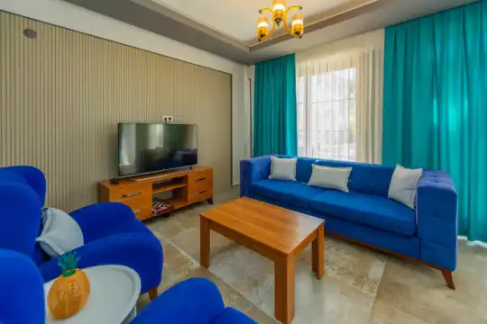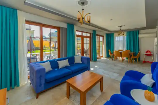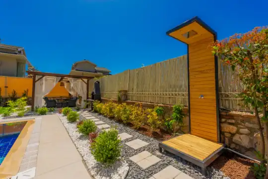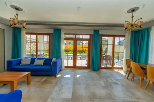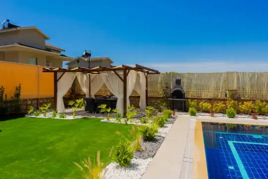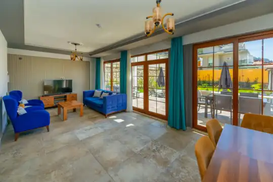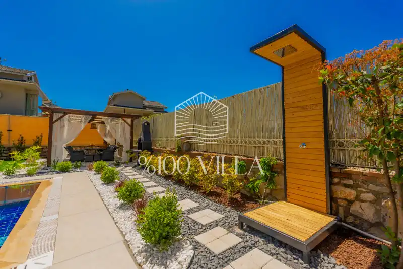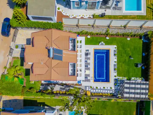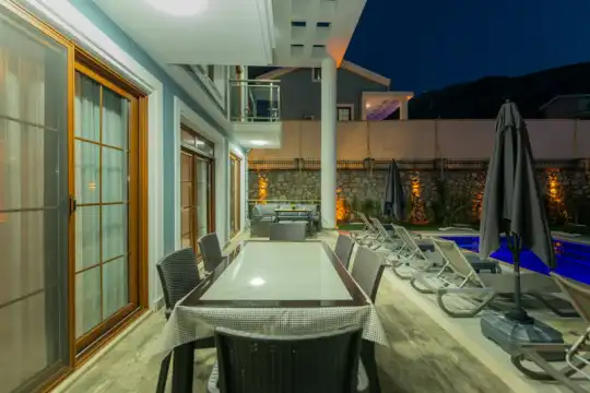 Geniş havuz terasında kapasiteye uygun şezlong takımı ve şemsiyeler, oturma grubu, salıncak,barbekü alanı ve çocuk oyun alanı bulunmaktadır.Kapasiteye uygun oturma grubu, ihtiyacınız olan her şeyi barındıran Amerikan tarzda mutfak, her birinde özel banyo bulunduran dört adet yatak odasının yanı sıra ebeveyn yatak odalarından birinde bir adet iki kişilik jakuzi bulunmaktadır. Ayrıca tüm yatak odalarında klima mevcuttur.Birinci yatak odasında Çift kişilik yatak ve jakuzi, ikinci ve üçüncü yatak odasında çift kişilik yatak,dördüncü yatak odasında ise tek kişilik iki adet yatak bulunmaktadır.