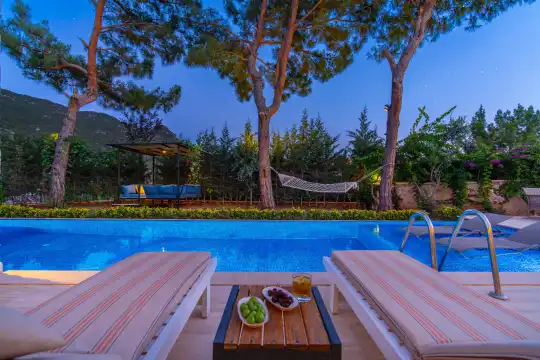Villamız Kaş/Kalkan tatil beldesinin sakin konumlarındanİslamlar mevkiinde yer almaktadır. Son yılların villa tatili gözdesi olmuş, etrafı ormanlarla çevrili, merkeze araçla 5 dakikada ulaşabildiğiniz konumu ve muhteşem mazarasıyla konaklayanlarına lüks bir tatil imkanı sağlamaktadır. Villa Narin 1, 4 kişilik kapasiteye sahip villada 2 yatak odası yer alıyor. Villanın her odasında da birer banyosu mevcut. Açık mutfağı ve kendine ait bahçesindevar. Mutfağında bulaşık makinesi, buzdolabı, ankastre fırın, ve mutfakta ihtiyaç olan hemen hemen bütün gereçler bulunuyor. Villanın bahçesinde özel havuzu mevcut. Barbekü, masa, sandalyeler, şezlonglar ve şemsiyeler bahçe keyfini sınırsız yaşamanıza imkan tanıyor. Salonunda oturma grubu, televizyon, eşyalar bulunurken, tüm odalar için ayrı klima imkanı var.