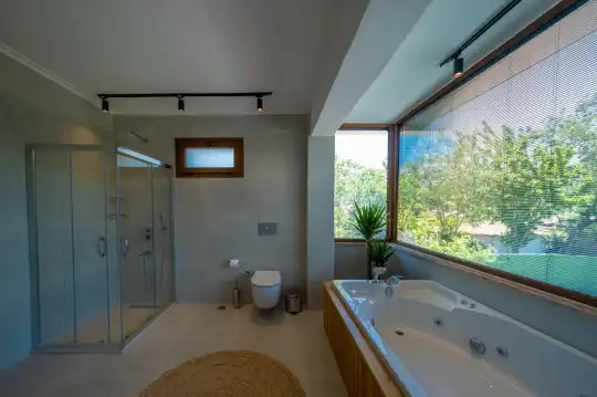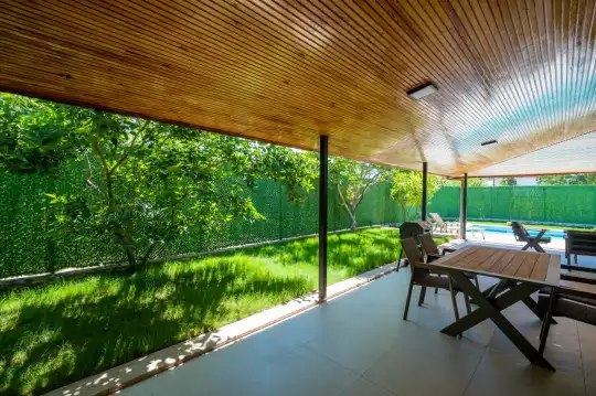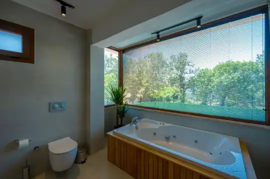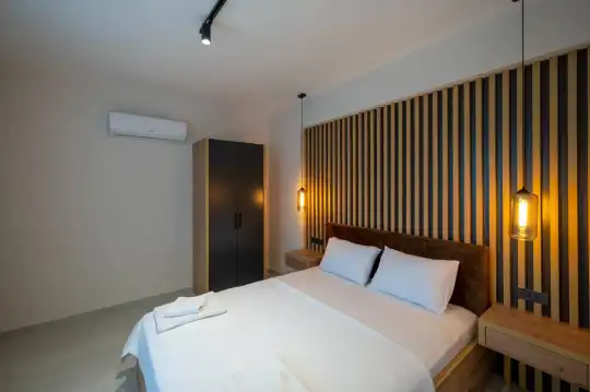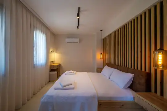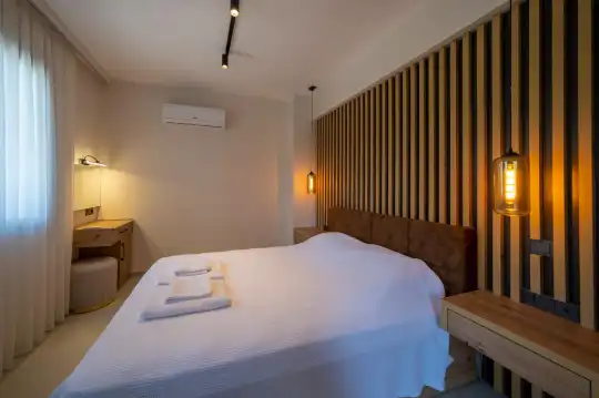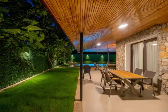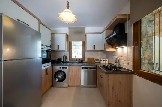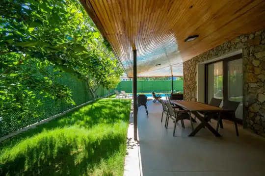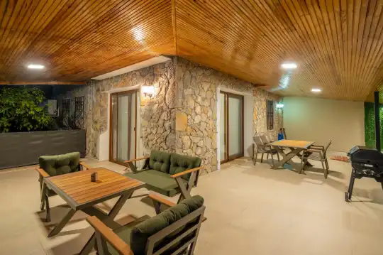 Çam ağaçlarıyla çevrili olan villa, Kayaköy'ün büyüleyici doğasına yaslanmış huzurlu bir ortam sunar. Geniş yeşil bahçesi ve dingin atmosferiyle, doğanın kucağında sakin bir tatil arayanlar için mükemmel bir kaçış noktasıdır. Villa, Kayaköy'ün tarihi dokusunu hissedebileceğiniz özel bir atmosfer yaratırken, geniş havuz terasında keyifli zaman geçirebilmeniz için jakuzi alanı da mevcuttur. Havuz terasında, şezlonglar, rahat oturma grubu, salıncak ve barbekü bulunmakta olup, her ayrıntı misafirlerin konforu düşünülerek tasarlanmıştır. Havuz alanına açılan geniş oturma odası, tam donanımlı açık mutfağıyla birleşirken, bir yatak odasında çift kişilik yatak ve ebeveyn banyosu, diğer yatak odasında ise iki tek kişilik yatak ve özel banyo yer almaktadır. Villa, tüm ihtiyaçlarınıza cevap verecek şekilde eksiksiz donatılmıştır.