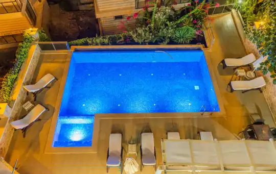 - Havuz Terası: Geniş havuz terası, 8 adet şezlong