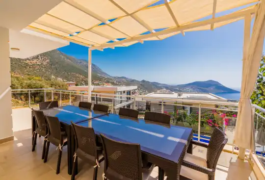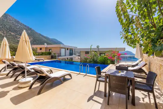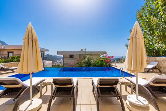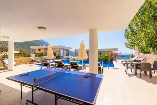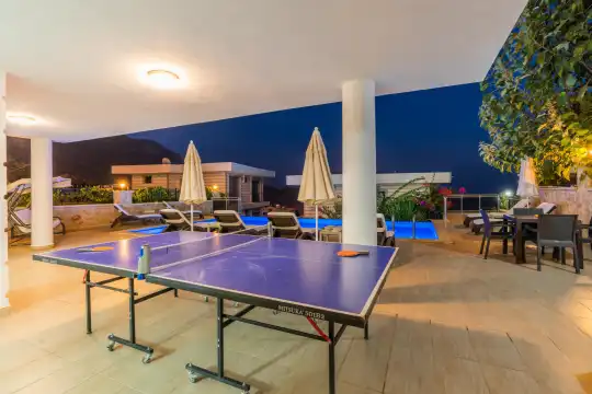 Büyük bir havuz terası ile keyifli bir tatil deneyimi sunan villa, 8 adet şezlong ile geniş bir dinlenme alanı sağlar. Ayrıca, bahçede masa tenisi gibi eğlenceli aktiviteler ile tatilinizi renklendirebilirsiniz.