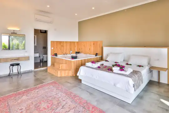 Doğanın kalbinde, kuş sesleri eşliğinde huzurlu bir tatil vadeden villamız, muhteşem deniz manzarasına sahiptir. Balayı çiftlerine özel olarak tasarlanan yatak odasında bulunan geniş jakuzi, konforunuzu üst seviyeye taşır.