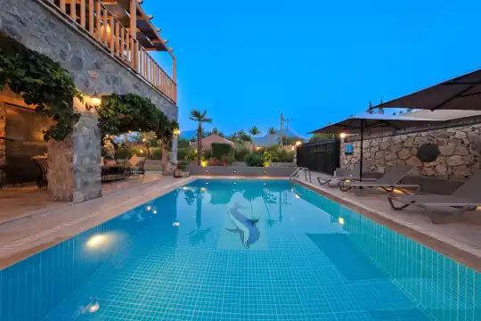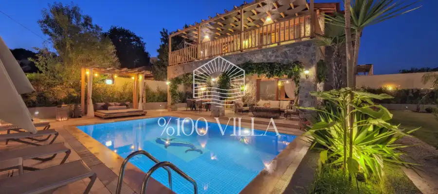 Villamız 8 kişilik kapasiteye sahiptir ve 4 yatak odası yer alır. Villanın 2 banyosu ve jakuzisi mevcut. Açık mutfağı ve kendine ait bahçesinde bir havuzu var. Mutfağında bulaşık makinesi, buzdolabı, ankastre fırın, tost makinesi ve mutfakta ihtiyaç olan hemen hemen bütün gereçler bulunuyor. Barbekü, masa, sandalyeler, şezlonglar ve şemsiyeler bahçe keyfini sınırsız yaşamanıza imkan tanıyor. Salonunda oturma grubu, televizyon, eşyalar bulunurken, tüm odalar için ayrı klima imkanı var.