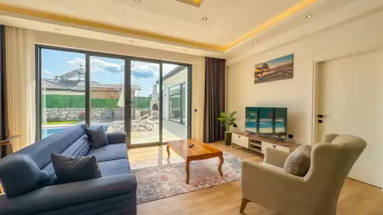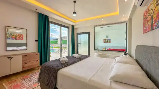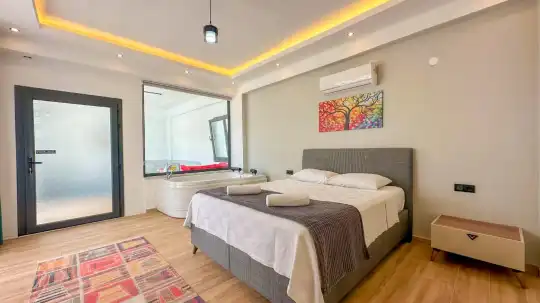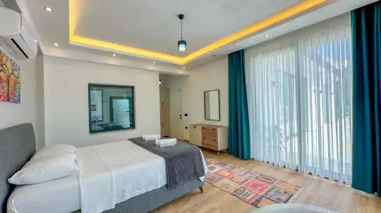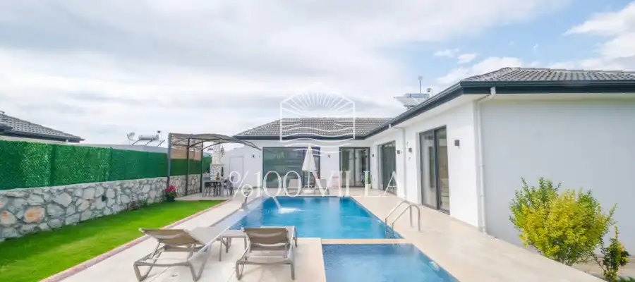 Merkezi konumu sayesinde tercihlerin başında gelen villa, oldukça ferah ve geniş bahçe alanında kapasiteye uygun şezlong takımı, oturma grubu, salıncak ve barbekü alanına sahiptir. Havuz terasına açılan zevkle döşenmiş oturma odası ve tam donanımlı mutfağı, bir yatak odasında çift kişilik yatak ebeveyn banyosu , ikinci yatak odasında da iki tek kişilik yatak ve ebeveyn banyosu bulunmaktadır.Bahçe alanı da içerisi kadar güzel dizayn edilmiştir.
