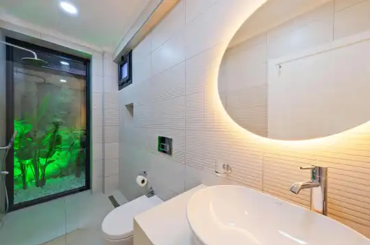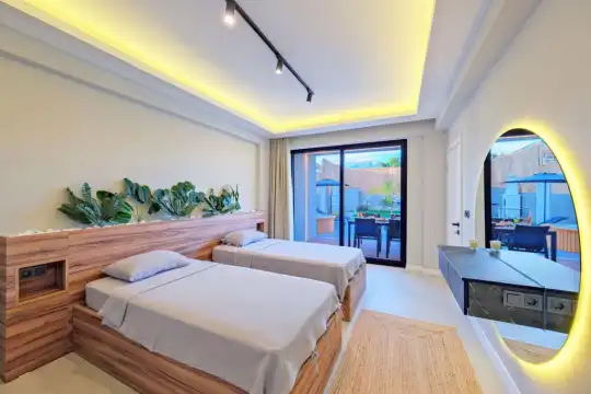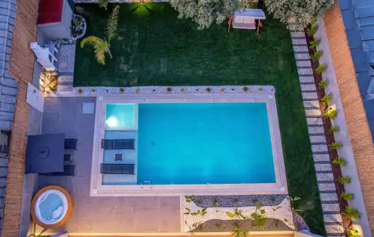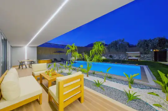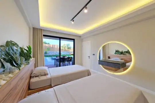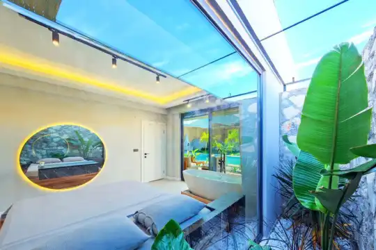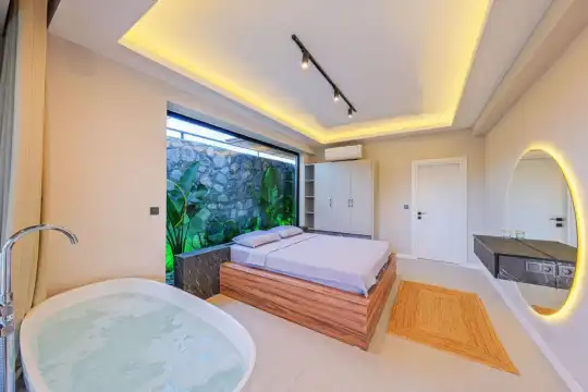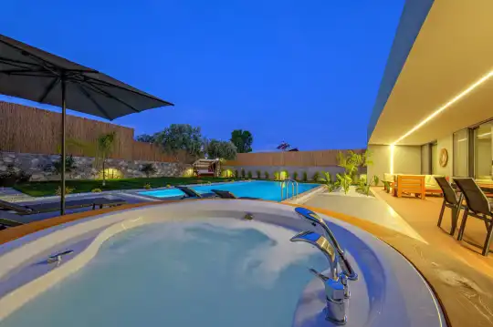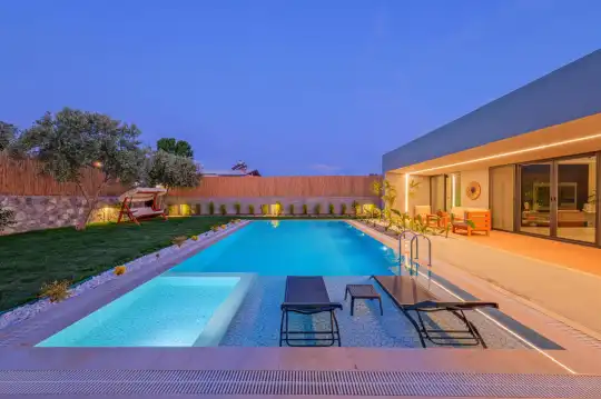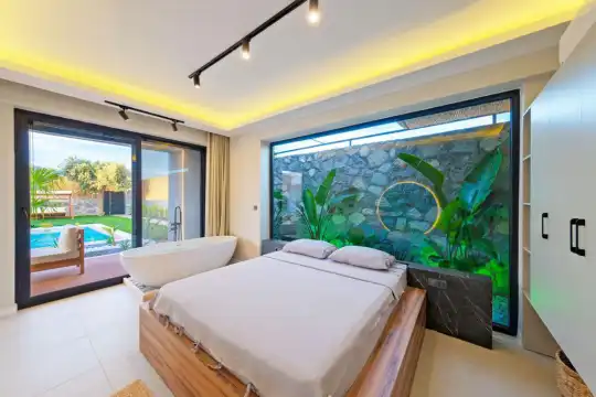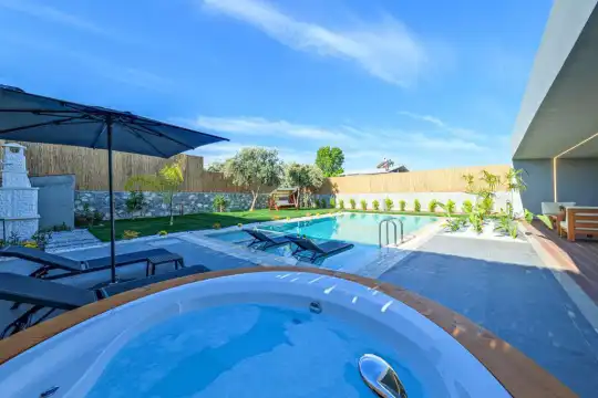 Merkezi konumu sayesinde tercihlerin başında gelen villa, oldukça ferah ve geniş bahçe alanında kapasiteye uygun şezlong takımı, oturma grubu, salıncak ve barbekü alanına sahiptir. Havuz terasına açılan zevkle döşenmiş konforlu oturma odası ve tam donanımlı mutfağı, bir yatak odasında çift kişilik yatak ebeveyn banyosu ve küvet; ikinci yatak odasında da iki tek kişilik yatak ve ebeveyn banyosu bulunmaktadır. Ayrıca havuz alanında bulunan jakuzisiyle doğanın ve gökyüzünün tadını çıkarabilme fırsatı sağlar. İç mekan yapısı ve donanımları da en az dış mekan kadar ferah, modern ve konforunuz ön planda tutularak oluşturulmuştur.