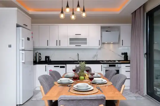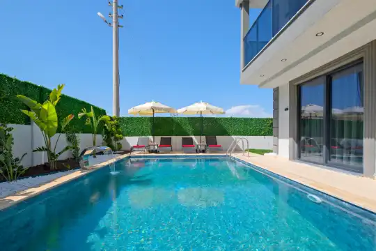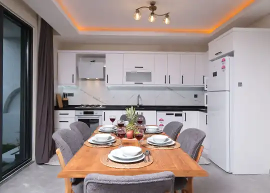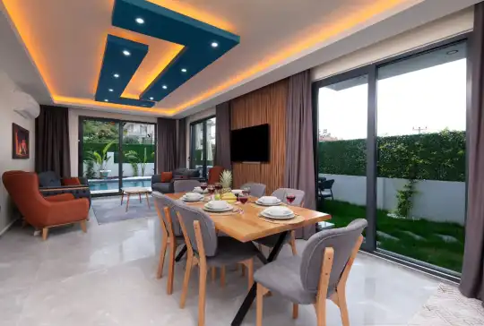 Açık plan mutfağı ve konforlu salonu sayesinde misafirlerin keyifle zaman geçirebileceği iç mekânlar sunan villa, gün boyu güneş alan havuz terasıyla da dinlenme ve eğlenceyi bir arada yaşatır.
