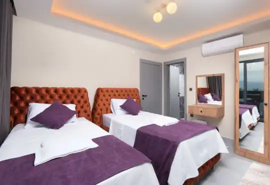 Fethiye’nin doğayla iç içe Patlangıç bölgesinde yer alan bu özel villa, 3 yatak odası ve 6 kişilik konaklama kapasitesiyle kalabalık aileler ve arkadaş grupları için ideal bir tatil imkânı sunmaktadır. Salonda bulunan konforlu koltuklar sayesinde kapasite 8 kişiye kadar çıkarılabilmektedir.