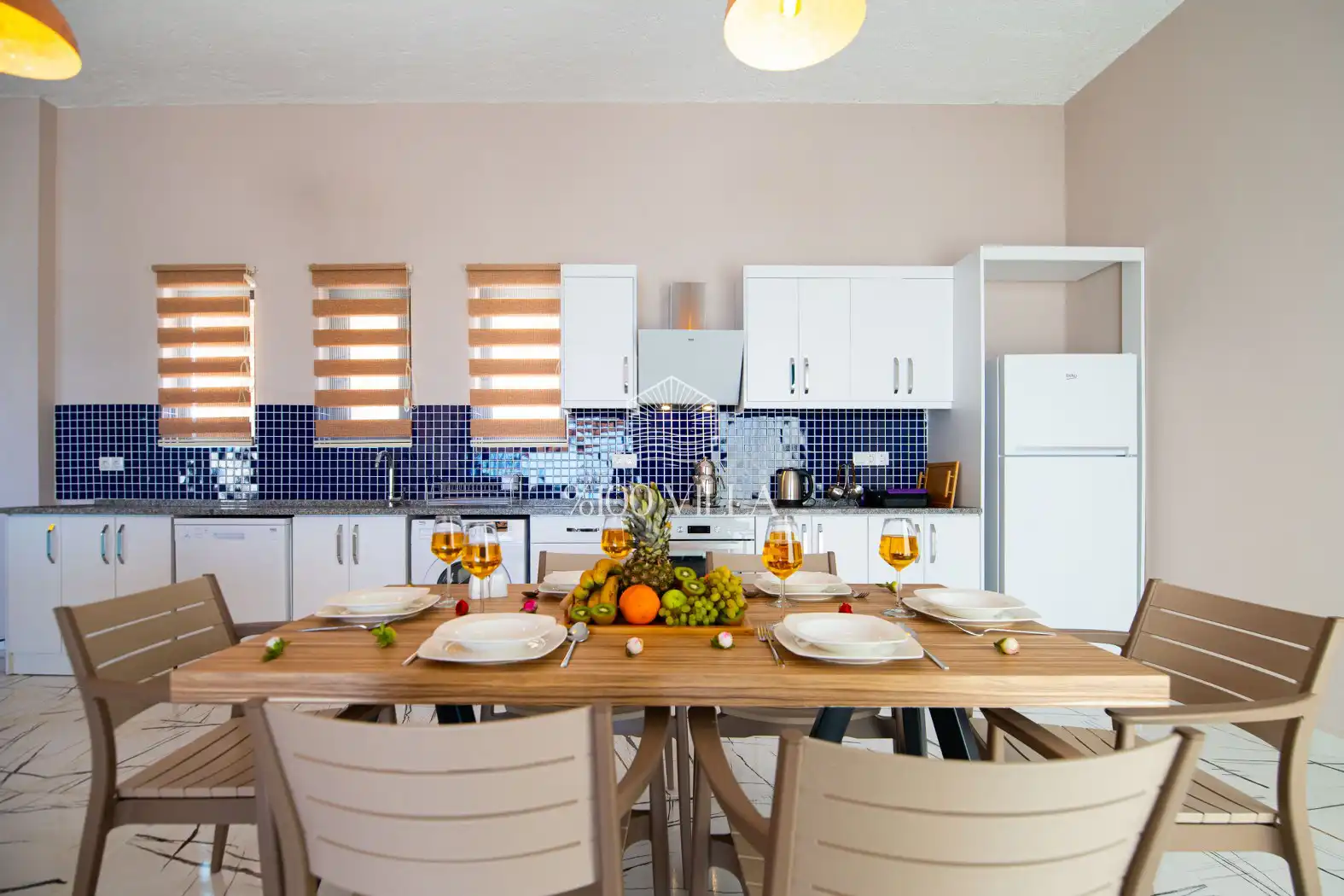 4 kişilik kapasiteye sahip villada 2 yatak odası yer alıyor. Villanın her iki odasında da birer banyosu mevcut.  Açık mutfağı ve kendine ait bahçesi var. Mutfağında bulaşık makinesi, buzdolabı, ankastre fırın, ve mutfakta ihtiyaç olan hemen hemen bütün gereçler bulunuyor. Villanın bahçesinde özel havuzu mevcut. Barbekü, masa, sandalyeler, şezlonglar ve şemsiyeler bahçe keyfini sınırsız yaşamanıza imkan tanıyor. Salonunda oturma grubu, televizyon, eşyalar bulunurken, tüm odalar için ayrı klima imkanı var. Ayrıca kapalı ısıtmalı havuz ve sauna da mevcuttur.