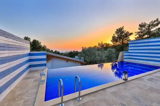 Kalkan’ın doğa ile iç içe muhteşem havası ve sakinliğiyle adından söz ettiren İslamlar mahallesinde bulunan Villa Sunset 1 sizlere unutulmaz bir tatil deneyimi sunmak için tasarlanmıştır.Yemyeşil ağaçların arasında muhteşem manzarası ile saklı cennetiniz olacak olan villamızda özellikle şehrin gürültüsünden kaçan,iç içe geçen binalarda rahat edemeyen ve havuz başında dilediği gibi eğlenmek isteyen misafirlerin tüm bu ihtiyaçları karşılanacaktır.Villa Sunset korunaklı yapısı ile balayı ve muhafazakar konsepte de sahiptir.