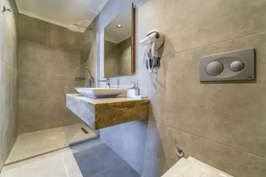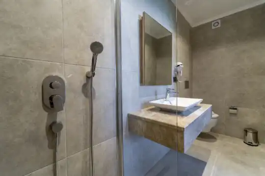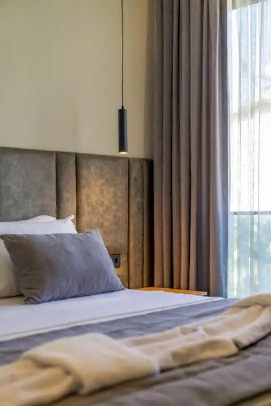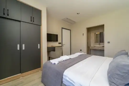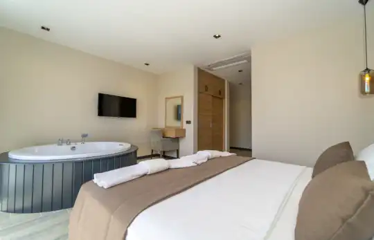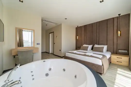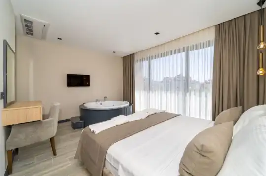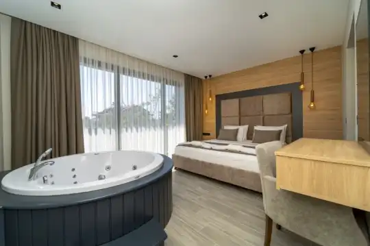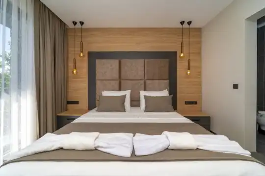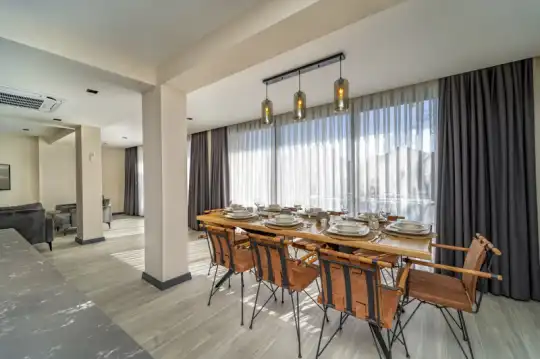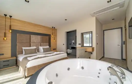 Havuz terasına açılan zevkle döşenmiş konforlu oturma odası ve tam donanımlı mutfağı, bir yatak odasında çift kişilik yatak ebeveyn banyosu ve fransız küvet; ikinci yatak odasında çift kişilik yatak, ebeveyn banyosu ve fransız küvet bulunmaktadır. İç mekan yapısı ve donanımları da en az dış mekan kadar ferah, modern ve konforunuz ön planda tutularak oluşturulmuştur.