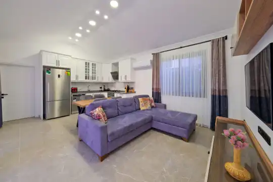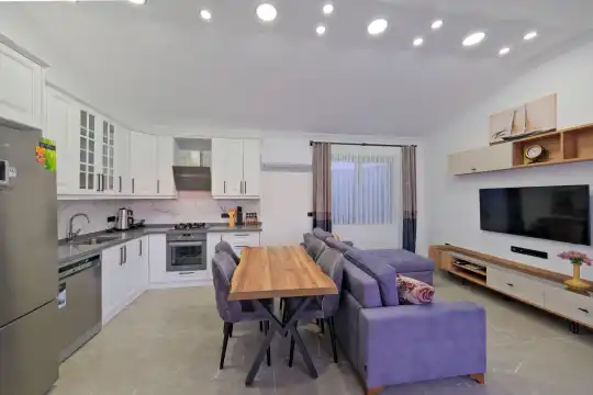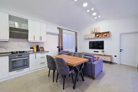 - Konforlu oturma odası, plazma TV, geniş yemek masası ve tam donanımlı mutfak.