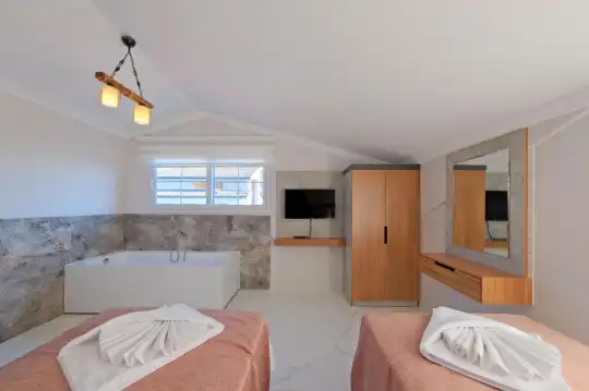 Fethiye’nin popüler Ölüdeniz mevkiinde yer alan bu geniş villa Tümen , 4 yatak odasıyla toplamda 8 kişilik konaklama kapasitesine sahiptir. Ölüdeniz Plajı’na sadece 5 dakikalık sürüş mesafesinde bulunan villa, kalabalık aileler ve arkadaş grupları için ideal bir seçenektir.