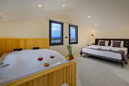 Fethiye Çalıca mevkiindeki bu villa, geniş aileler için ideal bir konaklama seçeneği sunuyor. 3 yatak odasıyla 6 kişilik kapasitesi, konforlu ve modern iç-dış mekan mobilyalarıyla tatilinizi keyifli hale getirecek. Ebeveyn odasında bulunan jakuzi, ekstra bir konfor sağlarken, merkezi konumu sayesinde merkeze ve plajlara kolayca ulaşmanızı sağlıyor. Rahat bir tatil için tercih edebileceğiniz harika bir seçenek!
