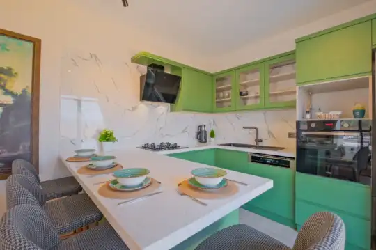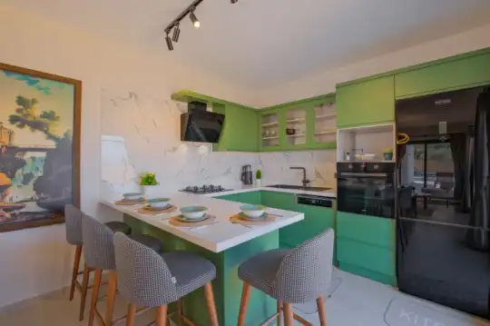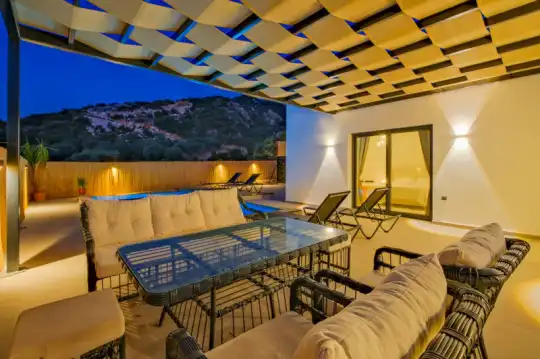 Merkezi konumu sayesinde tercihlerin başında gelen villa, oldukça ferah ve geniş bahçe alanında kapasiteye uygun şezlong takımı, oturma grubu, salıncak ve barbekü alanına sahiptir.