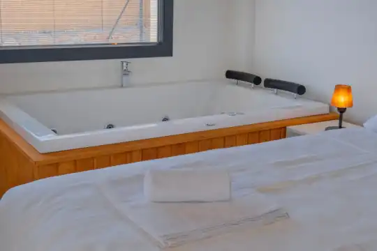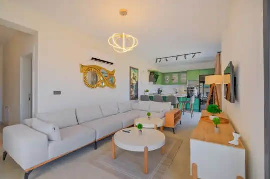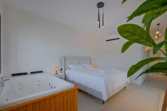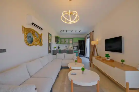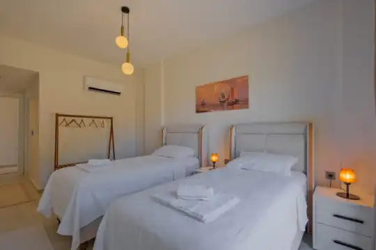 Havuz terasına açılan zevkle döşenmiş konforlu oturma odası ve tam donanımlı mutfağı, bir yatak odasında çift kişilik yatak ebeveyn banyosu ve fransız küvet; ikinci yatak odasında çift kişilik yatak, ebeveyn banyosu ve fransız küvet bulunmaktadır. İç mekan yapısı ve donanımları da en az dış mekan kadar ferah, modern ve konforunuz ön planda tutularak oluşturulmuştur.
