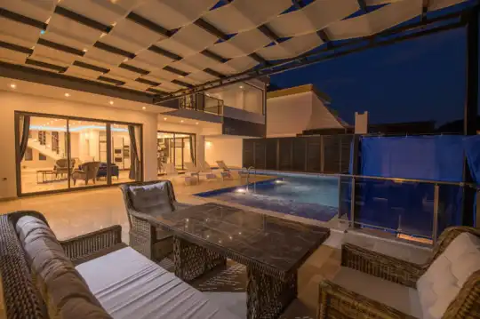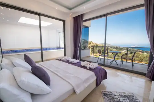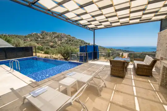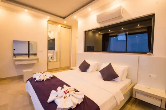 Villa Yağmur, Kalkan Kördere mevkiinde göz alıcı doğa ve deniz manzarasına sahip 2 yatak odalı lüks bir villadır. Villamız oldukça şık tasarıma sahip olup toplam 4 kişilik konaklama kapasitesi bulunmaktadır. Modern bir mimari anlayışı ile inşaa edilip iç dekorasyonu kaliteli eşyalarla dizayn edilmiştir. Villanın ebeveyn yatak odasındaki banyoda büyük bir jakuzi ve kapalı havuz mevcuttur. Kiralık muhafazakar villamızın havuz ve bahçesi korunaklı bir şekilde kapatılmıştır. Böylece havuzu dışarıdan görünmemektedir. Villa Yağmur, özellkle muhafazakar ailelermiz ile genç balayı çiftlerimiz için oldukça ideal bir seçenektir. Villamızda sizlerin keyifli tatil geçirebilmesi için saunaya da yer verilmiştir. Muhteşem bir villada tatil planı yapan tatil severlerimize Villa Yağmur’u tavsiye ediyoruz.